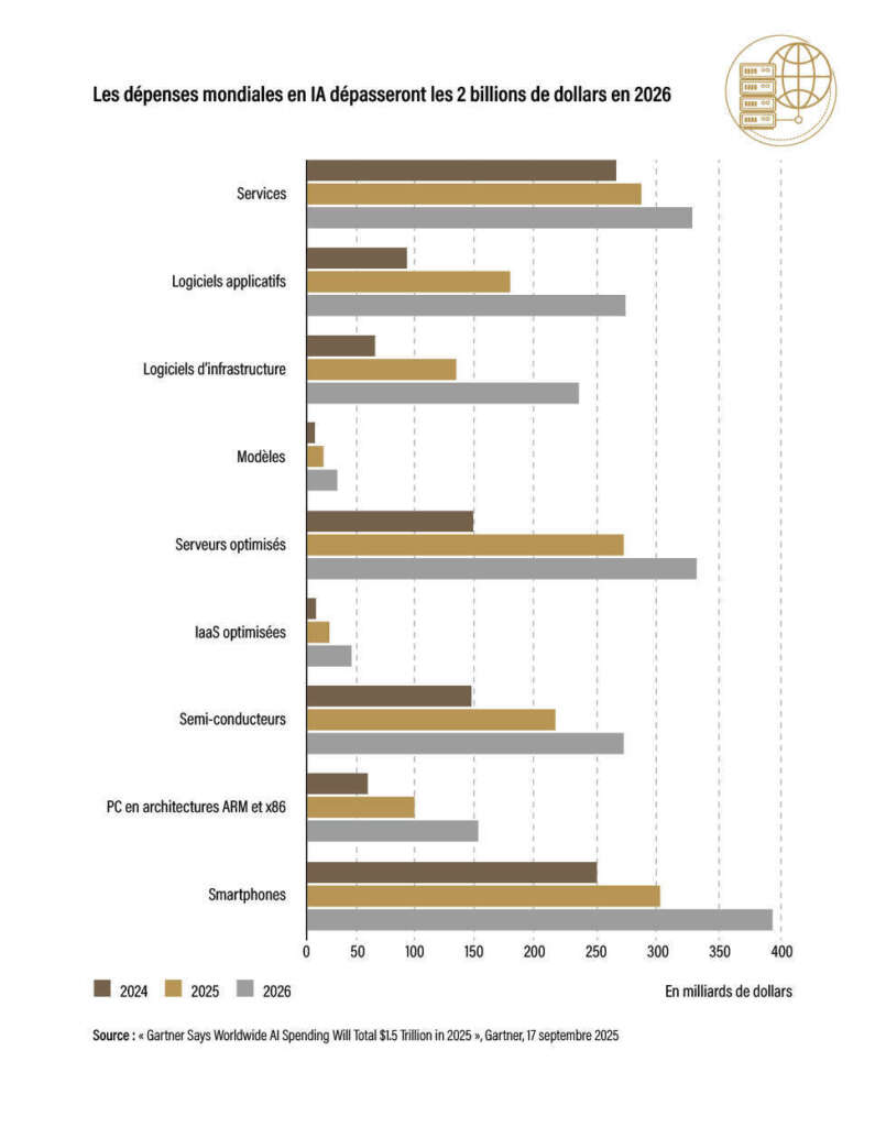 À l’horizon 2026, la question de la monétisation devrait enfin se concrétiser. Selon le cabinet Gartner, plus de huit entreprises sur dix auront testé ou déployé des applications de génération de contenus et les dépenses mondiales liées à l’intelligence artificielle pourraient dépasser les 2 000 milliards de dollars[1]. Gartner estime aussi que 40 % des applications d’entreprise intégreront des agents d’IA spécialisés, contre moins de 5 % aujourd’hui. L’intelligence artificielle s’installera ainsi au cœur des environnements professionnels – de la bureautique à la relation client, en passant par l’ingénierie – et deviendra un pilier incontournable des infrastructures numériques, qu’il s’agisse de cybersécurité, de cloud, de logistique ou de recherche.