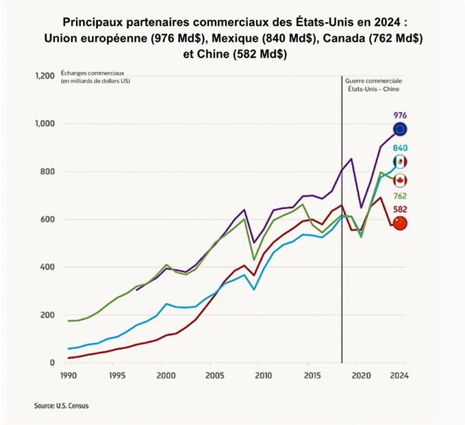 Ce changement de l’ordre international se traduit par une organisation croissante des échanges autour de blocs économiques et géopolitiques rivaux, fondés davantage sur l’alignement stratégique que sur la seule efficacité économique. Au cœur de cette dynamique figure le friend-shoring, c’est-à-dire la relocalisation des chaînes d’approvisionnement et de production vers des pays perçus comme politiquement alliés. Bien avant la dernière vague de hausses tarifaires, cette évolution était déjà perceptible dans les flux commerciaux. Selon les données de l’US Census Bureau, la part des importations américaines en provenance de Chine est passée de 21,6 % en 2018 à 13,4 % en 20244. Dans le même temps, le Mexique est devenu le premier partenaire commercial des États-Unis, représentant 15,5 % des importations américaines5, en 2024, contre 13,6 % six ans plus tôt —, un indicateur supplémentaire du recentrage des chaînes d’approvisionnement, favorisé par la proximité géographique et la réorientation stratégique des politiques commerciales.